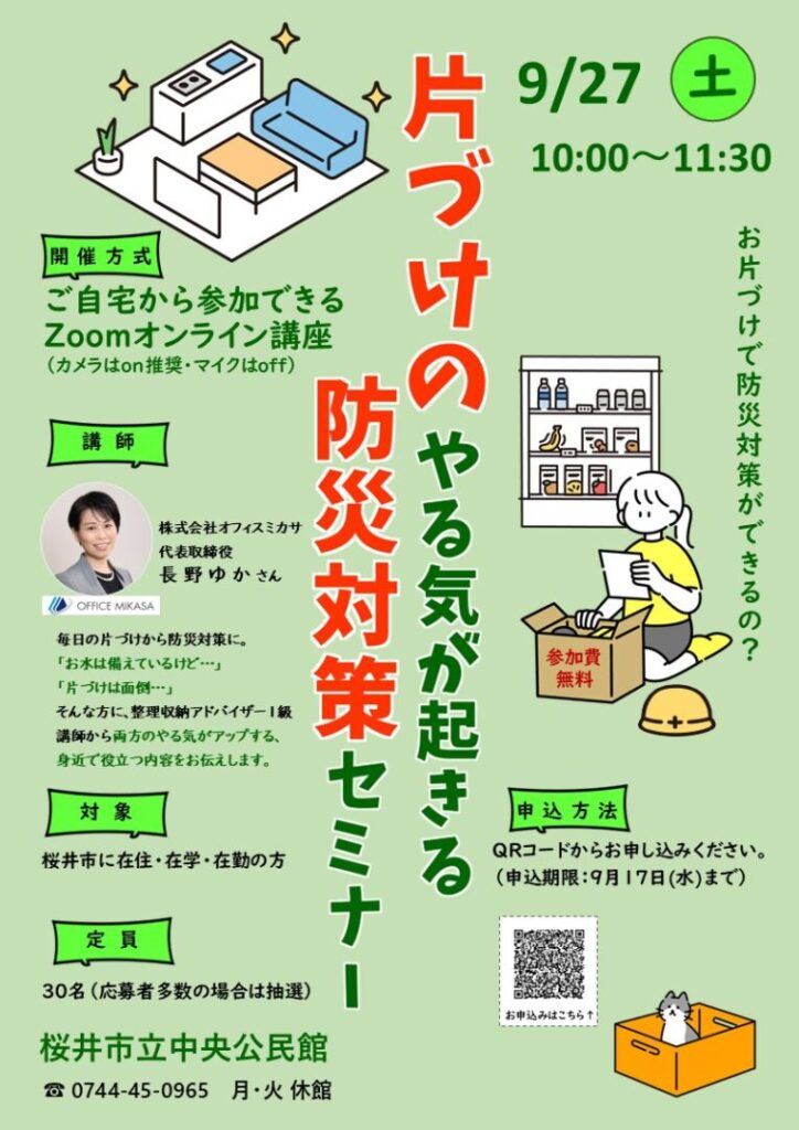 奈良県桜井市立中央公民館様からのご依頼で、普段の暮らしから災害に備えて片づけにも取り組める、両方のやる気がアップする身近な内容の講座を開催します。